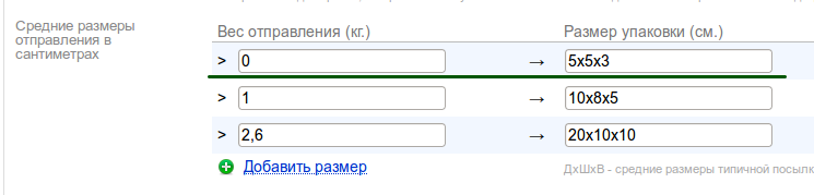 Например на иллюстрации ниже заданы две упаковки, первая «для заказов весом от 1 до 2,6 кг.», вторая — «для заказов тяжелее, чем 2,6 кг.».